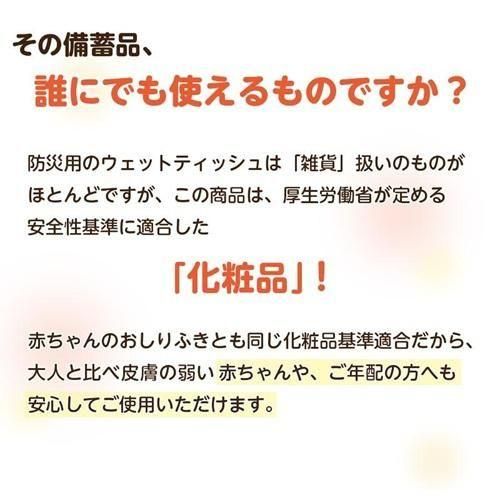 多くの防災用ウェットティッシュは『雑貨』扱いであり、『化粧品』ではありません。避難所には赤ちゃんだけでなく、皮膚トラブルに不安を持つ高齢者も多くいます。