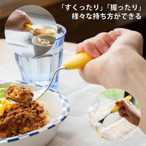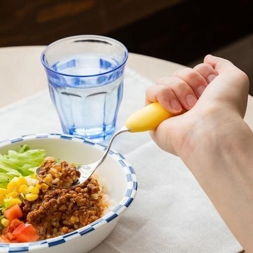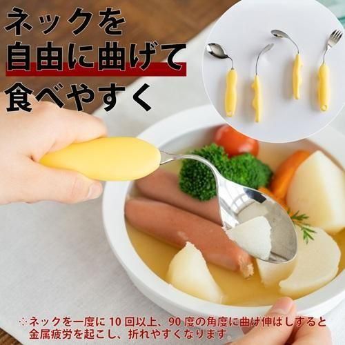 ネックは前後左右、自由に角度を変更可能。利き手に関係なく、すくい持ち、鉛筆持ち、握り持ちができるため、最も食べやすい角度にヘッドの位置を決めることができます。高齢者やお使いのスプーン、フォークが持ちにくいと感じている人、握る力の弱い人、手や指、腕の筋力が弱い人、ひじ、肩の関節に軽い運動障害がある人にも安心してお使いいただけます。