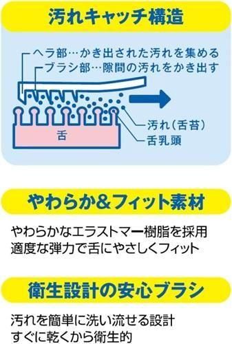 ブラシを舌にあて、ゆっくり奥から手前に引いて汚れをかき出します。