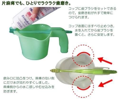 コップに歯ブラシをセットできるので、歯磨き粉が片手で簡単につけられます。