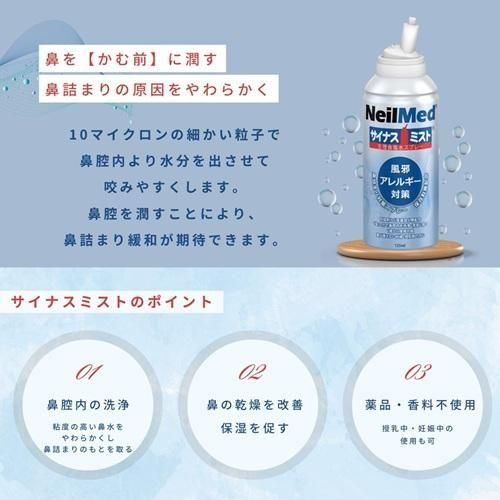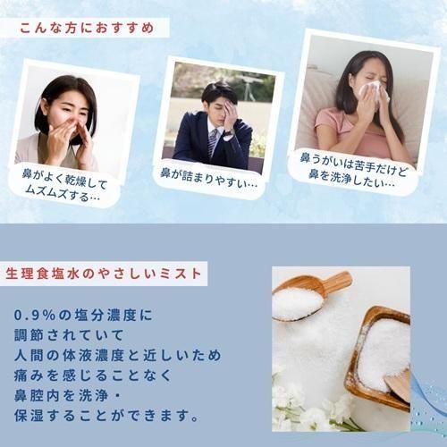鼻の中をやさしいミストで潤し、粘度の高い鼻水をやわらかくします。・鼻の乾燥、ムズムズ、また鼻をかむ前に使用して頂くと鼻を強くかまずに鼻詰まりのもとを取る事ができます。・防腐剤が入っていないから、幼児、妊娠中、授乳期の方でも安心してご使用いただけます。