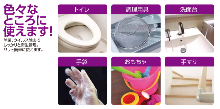 冬場のウイルス対策や、洗浄後の食器・調理器具などの除菌、日常の衛生管理に。
