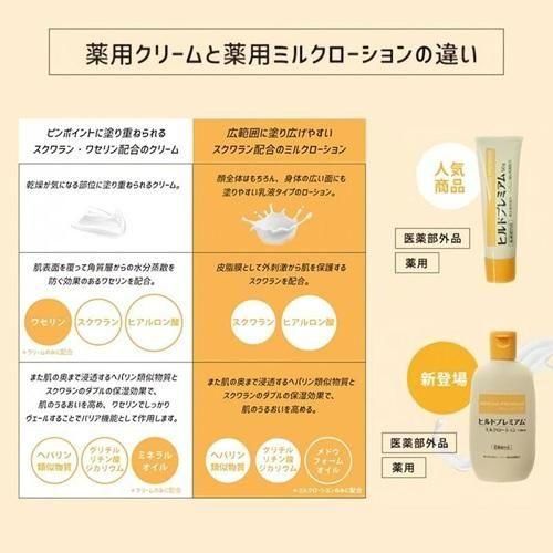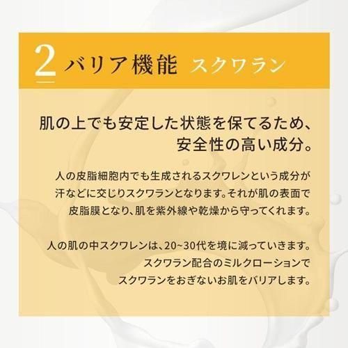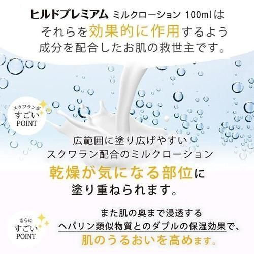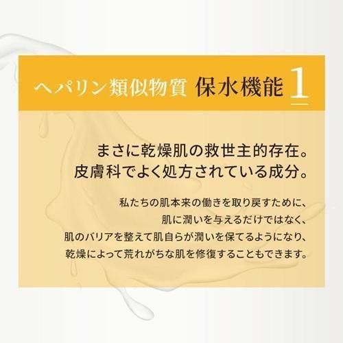 肌の隅々まで浸透する「ヘパリン類似物質」と「スクワラン」のダブル保湿効果で肌の潤いを高めます。「ヘパリン類似物質」は皮膚科で良く処方されている成分で、肌に潤いを与え、乾燥で荒れがちな肌を修復してくれます。「スクワラン」は皮膚膜として外の刺激から肌を保護する機能を持ちます。