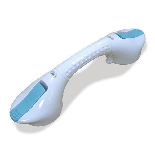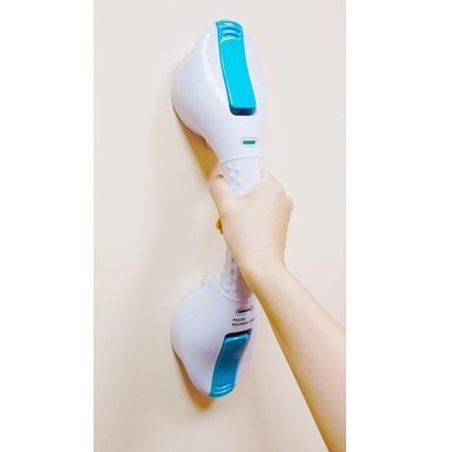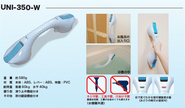 FRPやアクリル板などの荷重に耐えられる滑らかな平面に取り付けられます。凹凸やざらつき等を避け、ユニットバスの壁面や浴槽の内側等に取り付けて立ち上がりの補助としてご使用ください。タイルにも取り付けられますが、タイル自身の強度やタイル目地に吸盤がかからないことに注意してご使用ください。吸盤ですので空気を通すような壁面やクロス等の表面加工を施した壁面にはお取り付けできません。